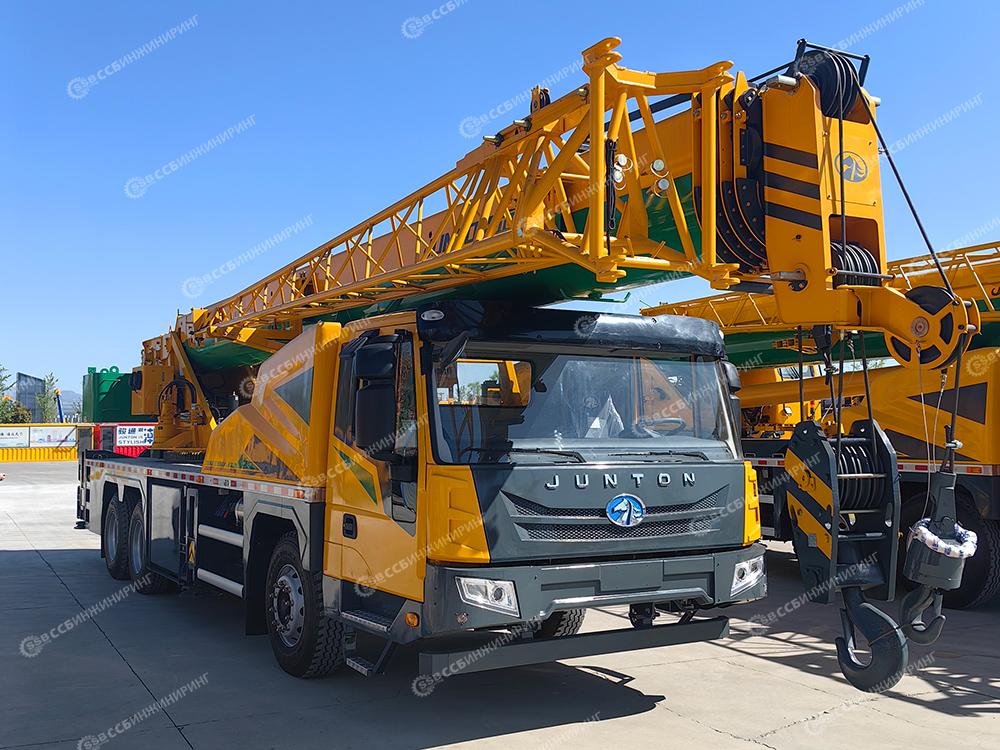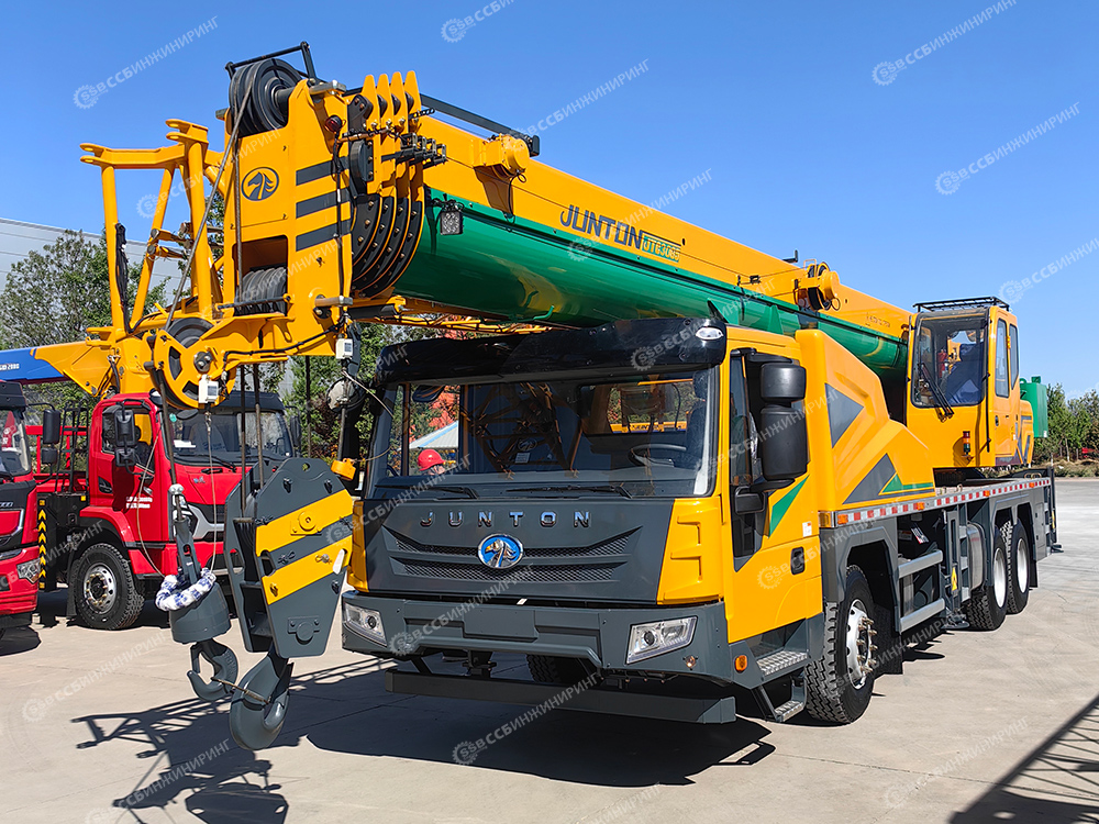 - Два необслуживаемых аккумулятора 12В с механическим выключателем питания, с помощью которого может быть отключено питание всего крана. Обмен данных между крановой установкой и шасси осуществляется через интерфейс CAN. Количество и расположение устройств освещения и светотехники соответствует требованиям Правил ООН №48. Дополнительно установлены прожектор на стреле.